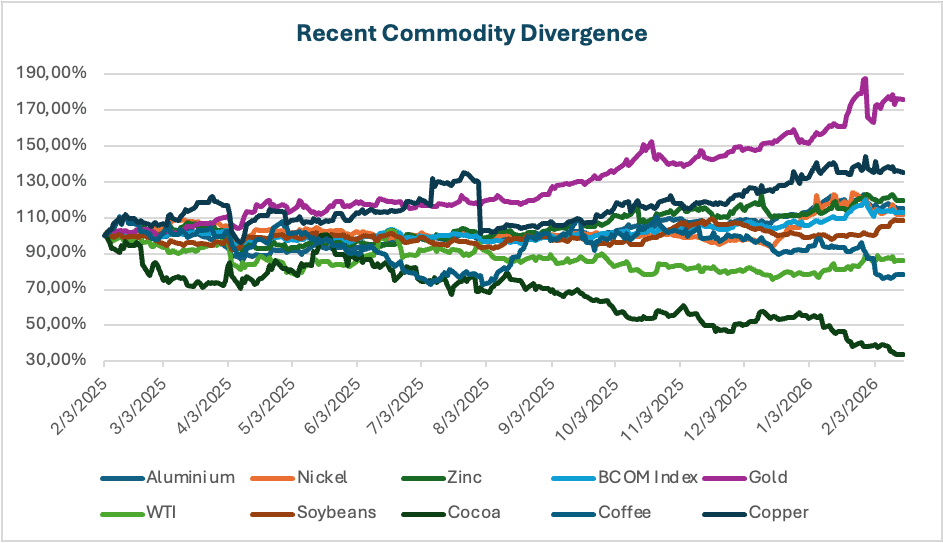 I mercati delle materie prime tendono a non seguire un andamento concomitante. La divergenza di performance tra le singole materie prime è diventata ancora più evidente da quando il QE (quantitative easing) si è ridotto, è iniziato il QT (quantitative tapering) e ha avuto inizio la guerra commerciale tra Stati Uniti e Cina (in entrambi i mandati di Trump).